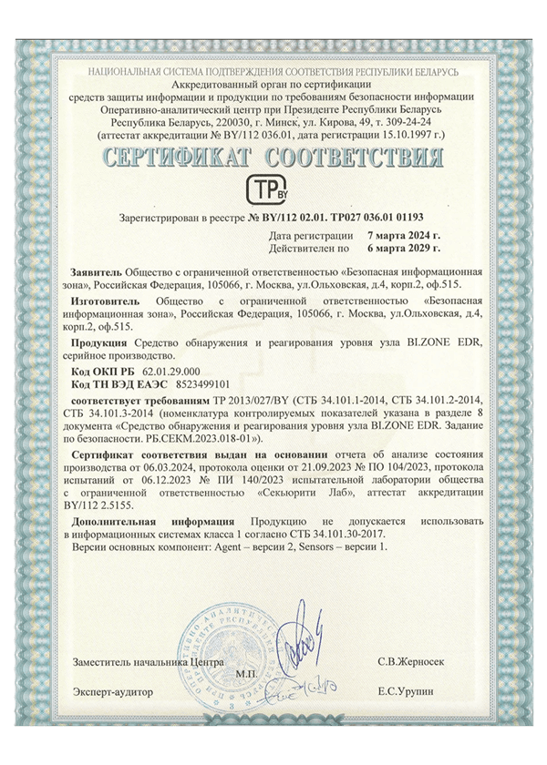 Регистрационный номер сертификата соответствия BY/112 02.01. ТР027 036.01 01193